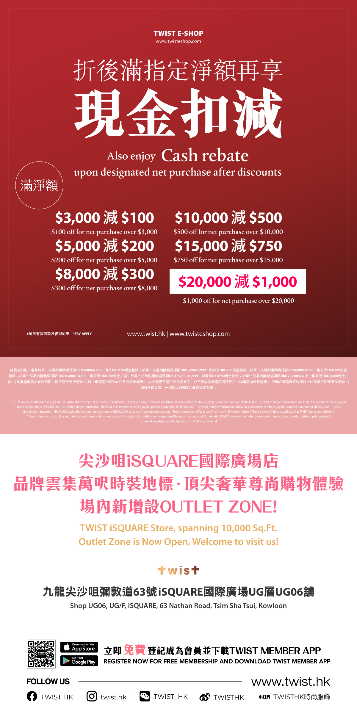 输入店员优惠码 全单满HK$3,000 即享HK$100扣减