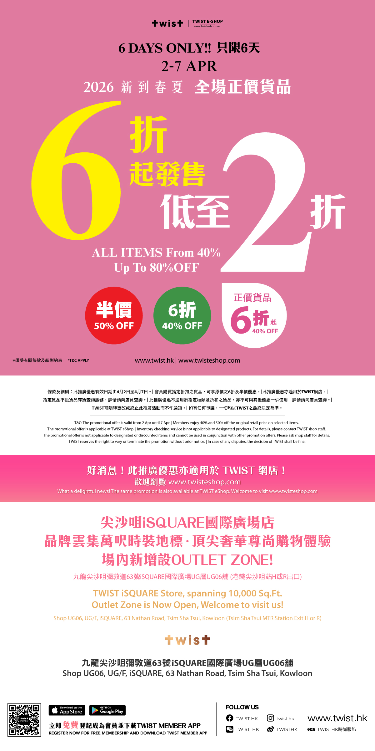 只限5天!全場貨品 6折起發售 低至2折發售!